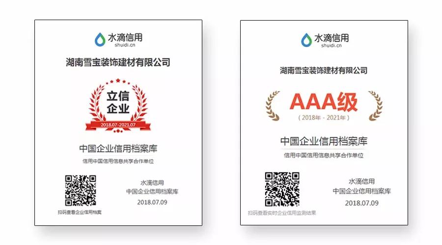 2018年7月9日,湖南雪寶裝飾建材有限公司榮獲由權(quán)威第三方評價機構(gòu)水滴信用評價中心頒發(fā)的“國家信用體系建設(shè)核心合作伙伴首批誠信推薦企業(yè)——立信企業(yè)”和“AAA級優(yōu)秀企業(yè)信用等級證書”。