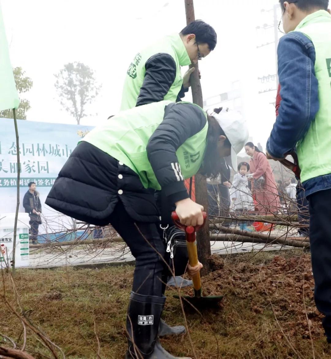 清晨的江邊還是霧氣蒙蒙,參與植樹的雪寶家人就扛著鐵鍬,一起種下一棵棵樹苗,他們個個熱情高漲、干勁十足,他們幾個人一組,扶直樹苗、揮鍬培土、踩實壓緊,確保做到保質(zhì)、保量、保成活。
