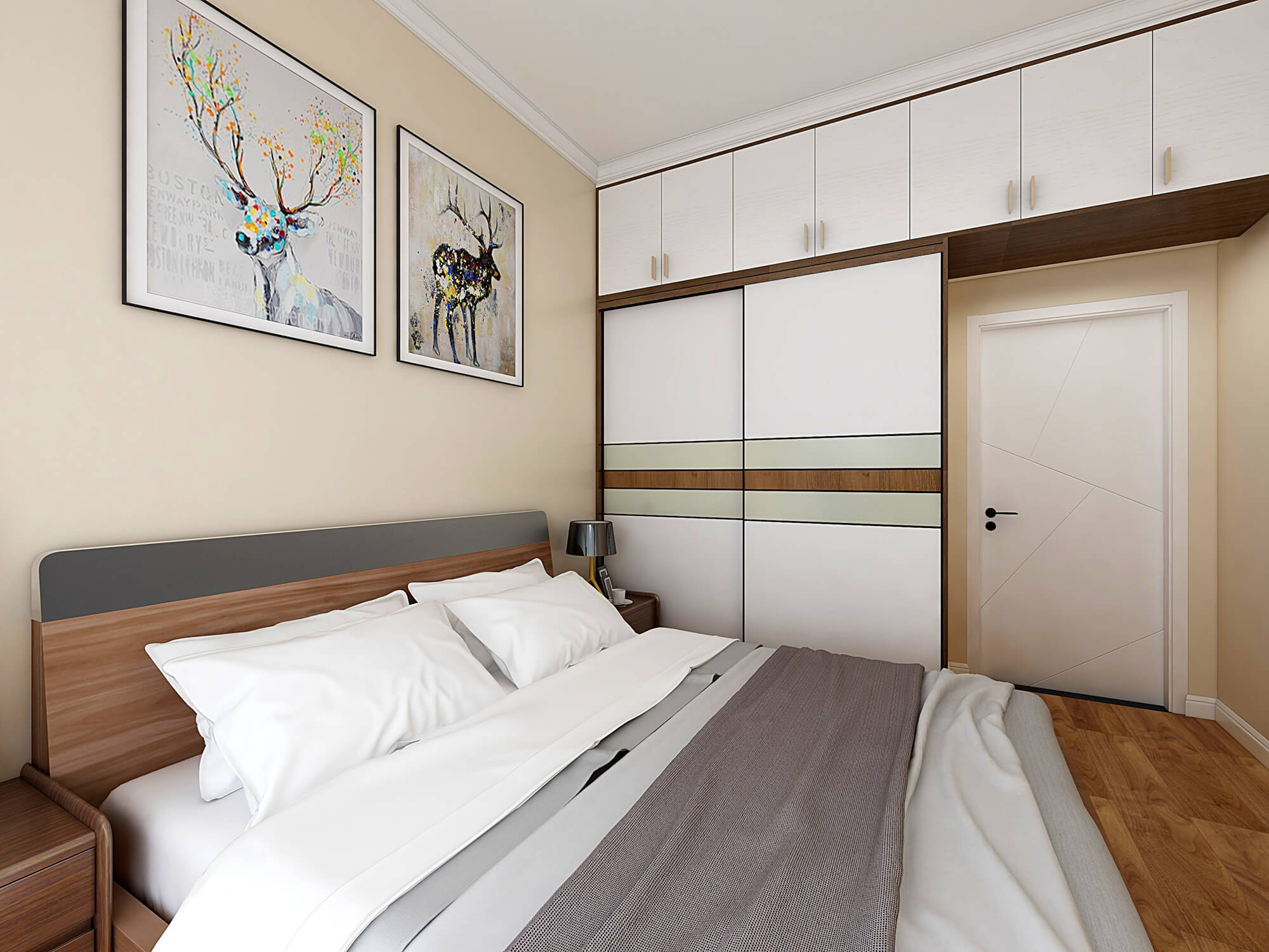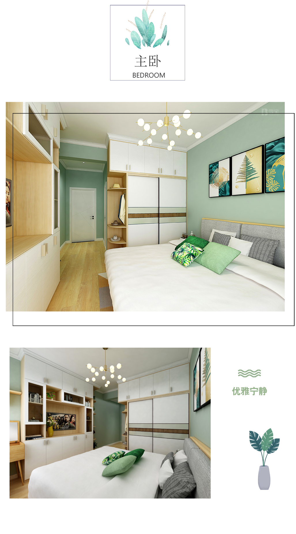 薄荷綠的點綴設計,能為臥室營造一個安靜的休息環(huán)境,仿佛能時刻感受到大自然的和煦微風和溫暖陽光,床頭對面白色柜子的設計,既擴大儲存空間,又增添一抹優(yōu)雅!