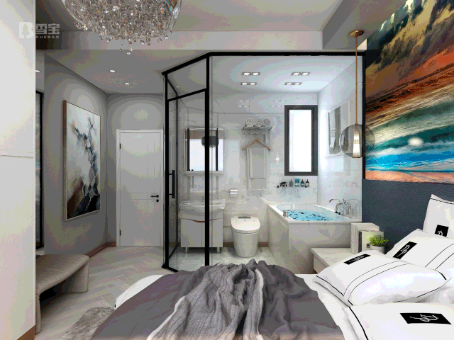 主臥設(shè)計(jì)無(wú)疑也是盡可能擴(kuò)容收納和加強(qiáng)功能性,同時(shí)兼顧了女主人的喜好,大衣柜、床頭柜、簡(jiǎn)易書(shū)桌柜、飄窗柜在整個(gè)空間各顯其能。衛(wèi)生間采用智控鋼化玻璃打造隔斷,不用之際,主臥空間視覺(jué)開(kāi)闊明朗,使用之時(shí),智控裝置為生活隱私保駕護(hù)航,實(shí)現(xiàn)虛實(shí)自由掌控。