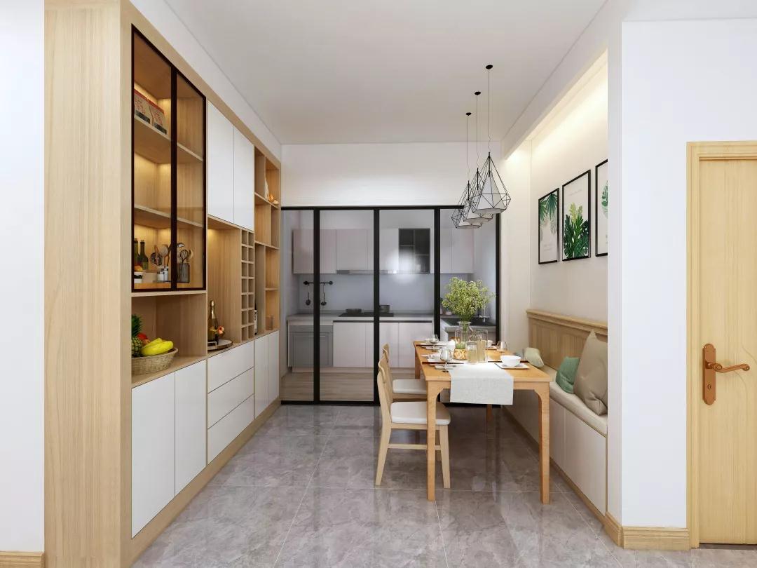 餐廳區(qū)域,金秋玉錦類(lèi)似原木細(xì)密的天然紋理及其柔和的色彩,加上綠植的點(diǎn)綴,回歸大自然的感覺(jué)?臻g利用最大化,長(zhǎng)桌搭配帶儲(chǔ)物性能的卡座。充滿(mǎn)北歐氣息的 吊燈,光影重疊間,溫馨滿(mǎn)滿(mǎn)。