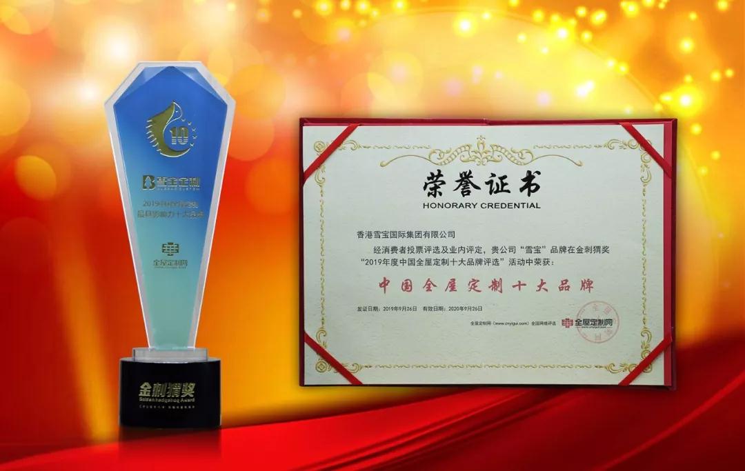 2019年11月5日,2019家居建材行業(yè)高峰論壇暨金刺猬獎十大品牌頒獎典禮在寧國伯爵王朝大酒店榮耀盛啟,本次盛典以“新形勢、新機遇、新未來”為主題。雪寶品牌憑借永葆創(chuàng)新的旺盛活力和優(yōu)質(zhì)的服務(wù)口碑最終評選出了具有權(quán)威性的“中國全屋定制十大品牌”榮譽。