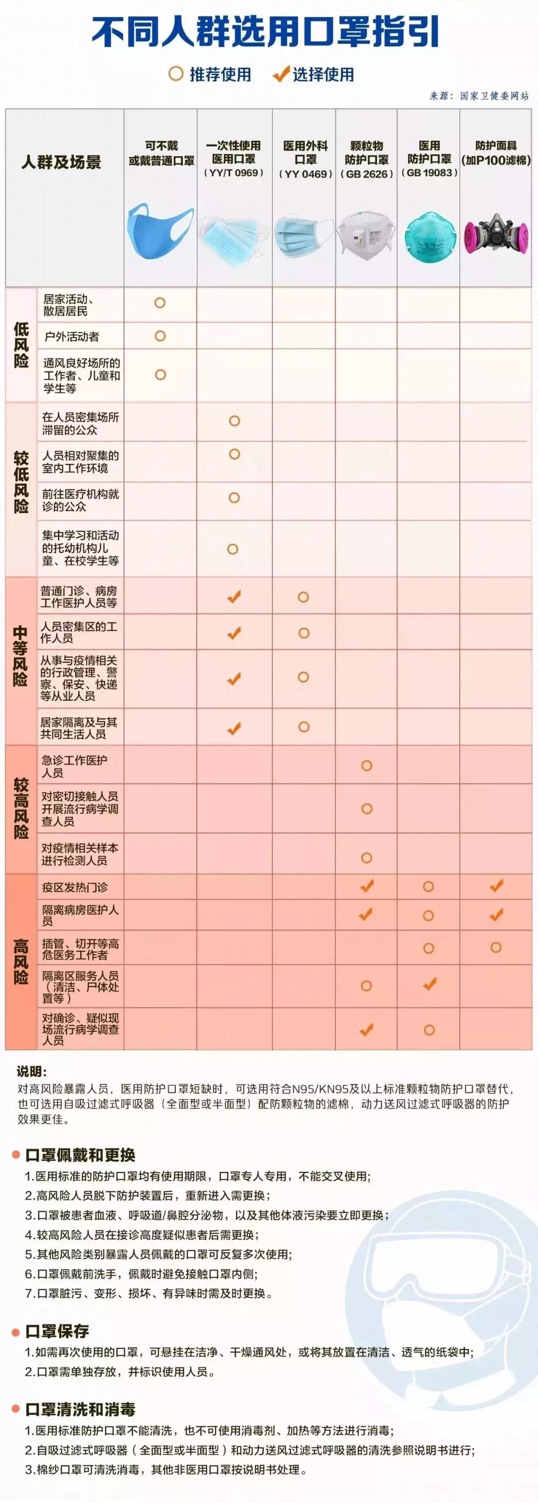 可能很多人會問,我怎么判斷感染風(fēng)險(xiǎn)是高還是低?別急,就在2月5日國家衛(wèi)健委等權(quán)威機(jī)構(gòu)聯(lián)合發(fā)布了《口罩選擇與使用技術(shù)指引》,看看下面這張圖,就知道什么時(shí)候該戴,什么時(shí)候可以不戴了。畢竟口罩珍貴,且用且珍惜。