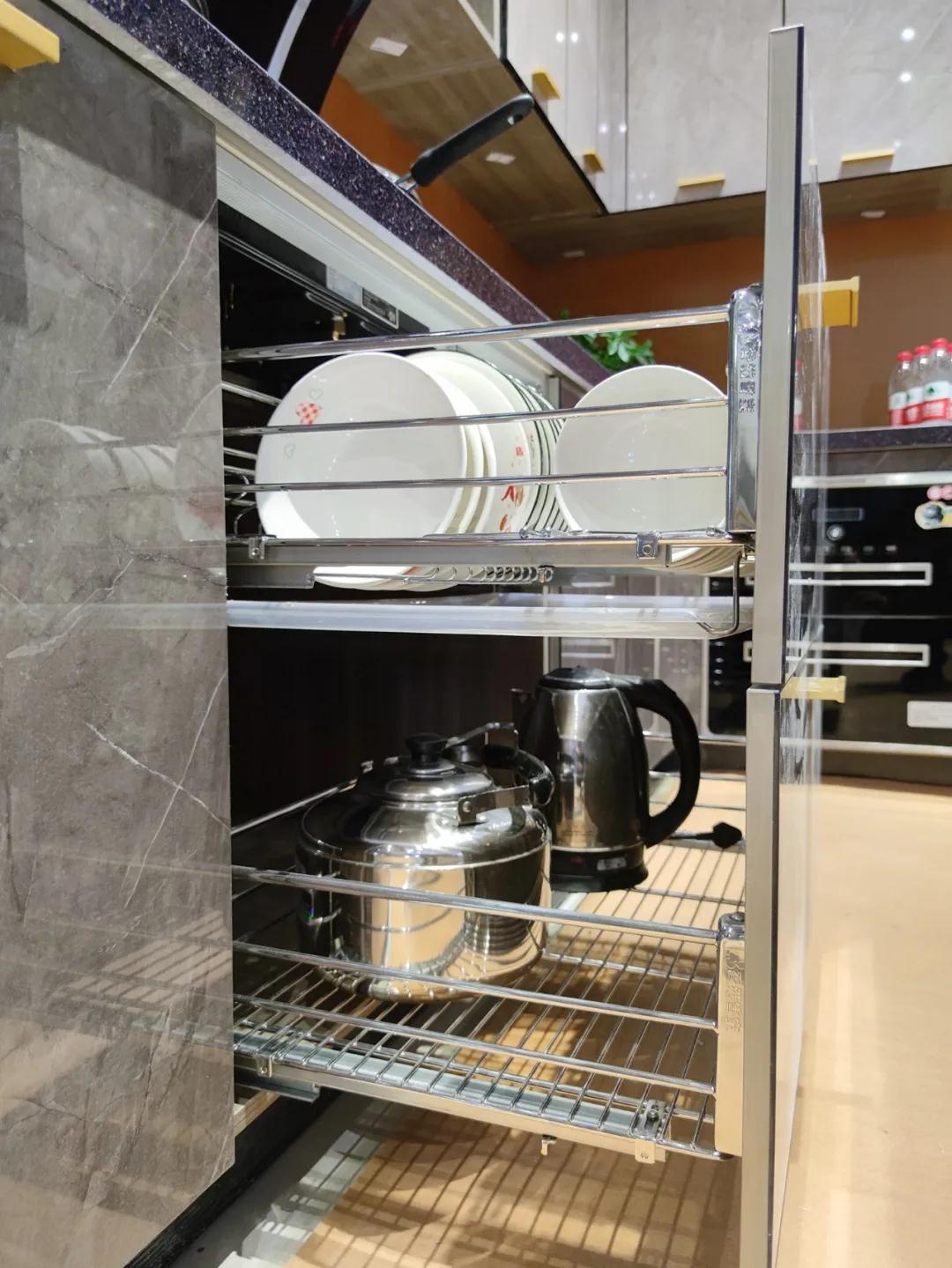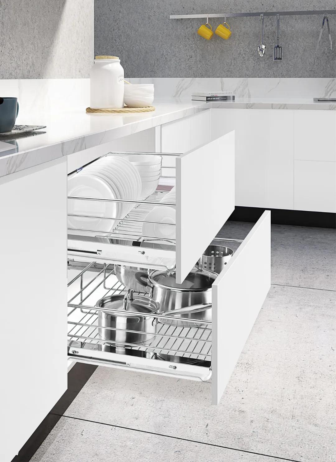 櫥柜拉籃:要說櫥柜的收納,不得不提到拉籃,F(xiàn)代的廚房櫥柜中,拉籃是必不可少的五金件之一。它提供了更多收納的可能,讓廚房更加整潔干凈。有了拉籃,廚房里大大小小的餐具再也不會堆成“慘劇”了。