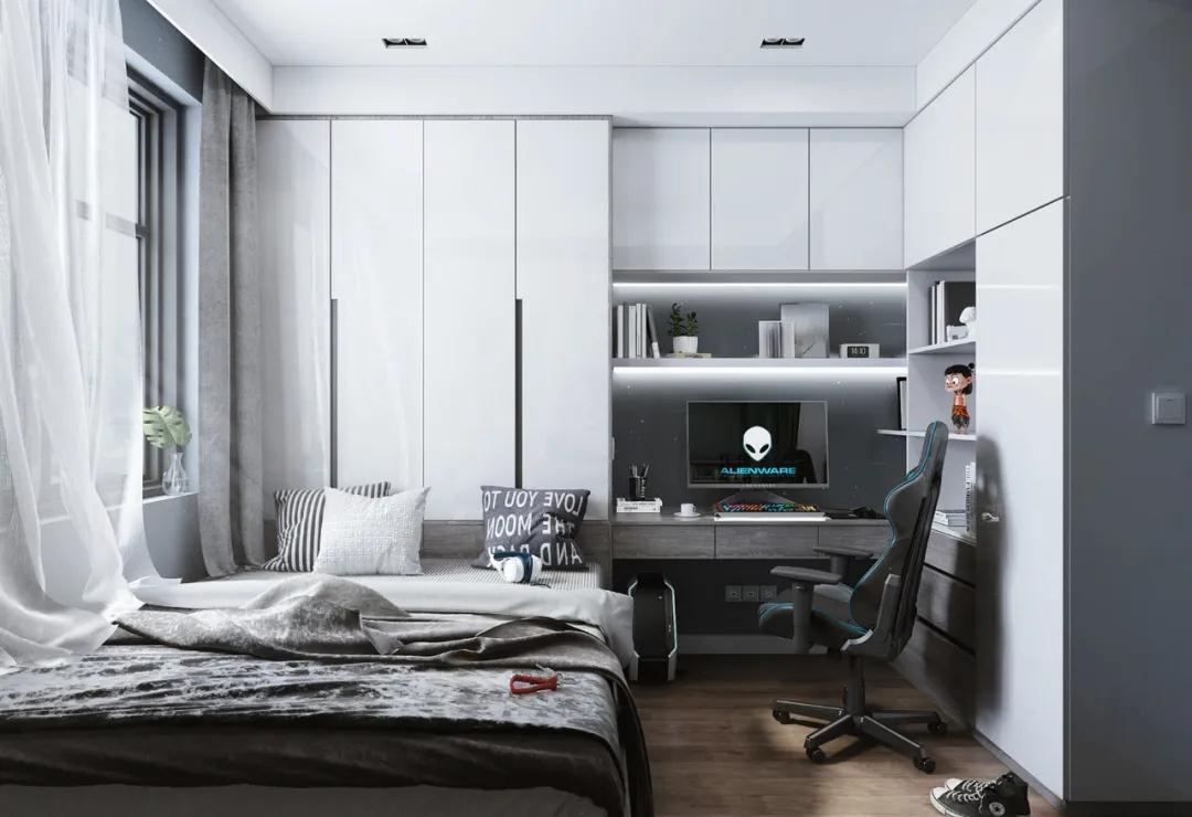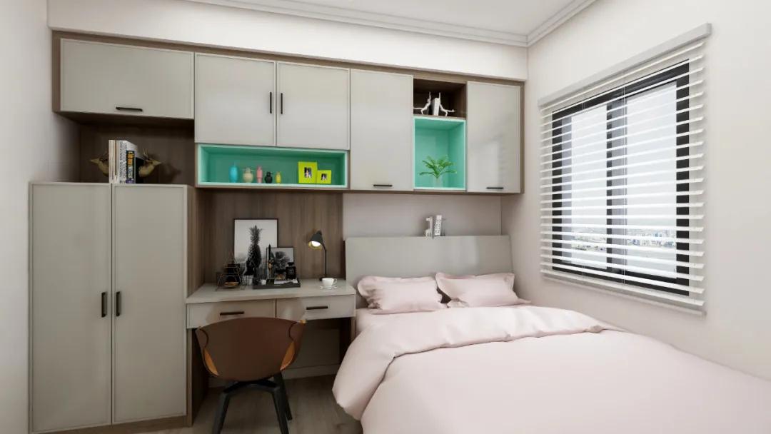 另外,書桌、柜體和床頭整體相連的設(shè)計,能合理規(guī)劃布局。