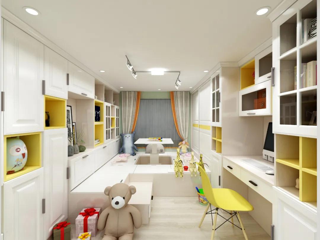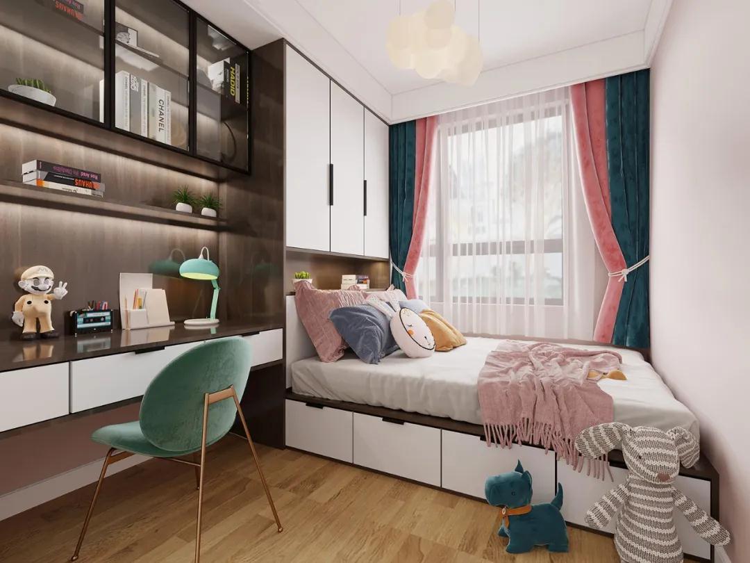 兒童房抬高的一體式榻榻米不僅為好動的孩子提供了足夠的游戲區(qū)域,軟硬合適的床面也有益于孩子骨骼成長,也不用擔(dān)心孩子睡覺摔下地了。