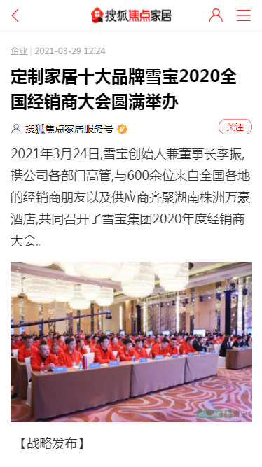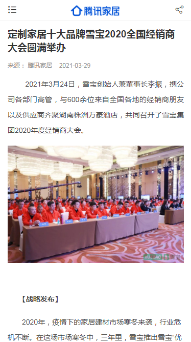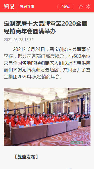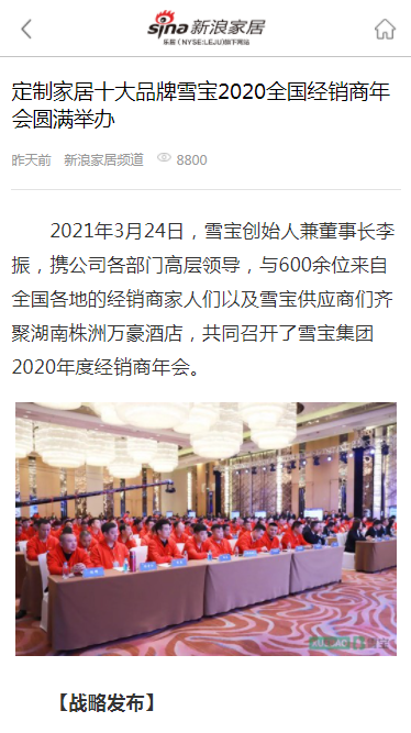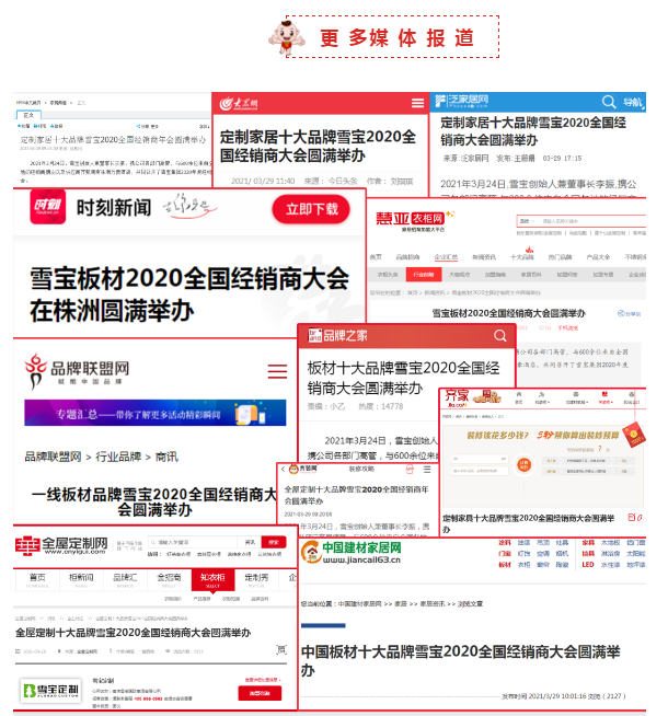 今日頭條、百度、360、新浪家居、搜狐焦點(diǎn)、網(wǎng)易家居、騰訊家居、中國(guó)保護(hù)消費(fèi)者基金會(huì)、中國(guó)質(zhì)量新聞網(wǎng)、中國(guó)木材與木制品流通協(xié)會(huì)、中國(guó)質(zhì)量萬(wàn)里行、中國(guó)建材網(wǎng)、慧亞網(wǎng)、一兜糖、小紅書(shū)、慧聰網(wǎng)、中華衣柜網(wǎng)、央廣網(wǎng)、太平洋家居網(wǎng)、品牌網(wǎng)、齊家、全屋定制網(wǎng)、中國(guó)木業(yè)網(wǎng)、紅網(wǎng)等等上百家行業(yè)主流、權(quán)威媒體爭(zhēng)相關(guān)注,開(kāi)啟專題報(bào)道,將雪寶2020年度經(jīng)銷商年會(huì)盛典線上曝光度推向高潮。