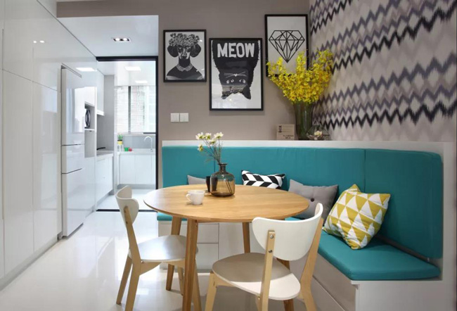 對(duì)于小戶型餐廳來(lái)說(shuō)“卡座”就是救星,卡座設(shè)計(jì)非常節(jié)省家居空間,這種設(shè)計(jì)合理地利用了家居空間,讓新房環(huán)境變得更加寬敞明亮,日常走動(dòng)也變得方便自由許多?ㄗO(shè)計(jì)也方便家庭的衛(wèi)生清潔,不用移動(dòng)太多的桌椅,也少了磕碰事件的發(fā)生,很是安全衛(wèi)生。另外,卡座設(shè)計(jì)還具備一定的收納能力,我們可以將物品擺放在卡座下方的收納格里面,緩解家庭的收納壓力,真的非常實(shí)用。使用板材十大品牌雪寶生態(tài)板還能保證甲醛釋放,不用擔(dān)心環(huán)境問(wèn)題。