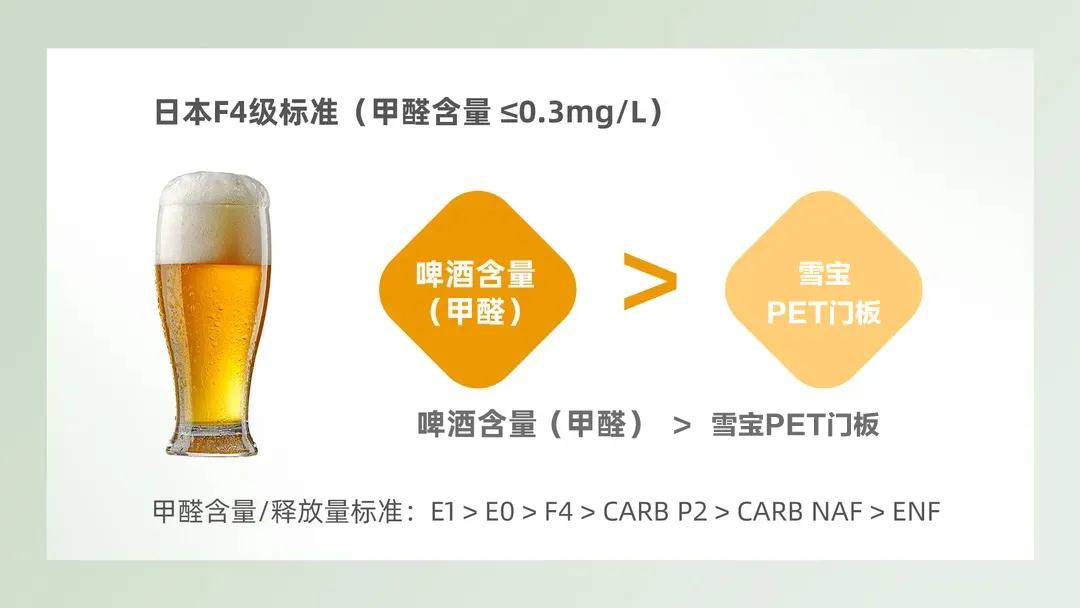 此外,雪寶PET門板環(huán)保等級基材達(dá)到F4星級,PET飾面膜零甲醛釋放,真正健康安全的產(chǎn)品!