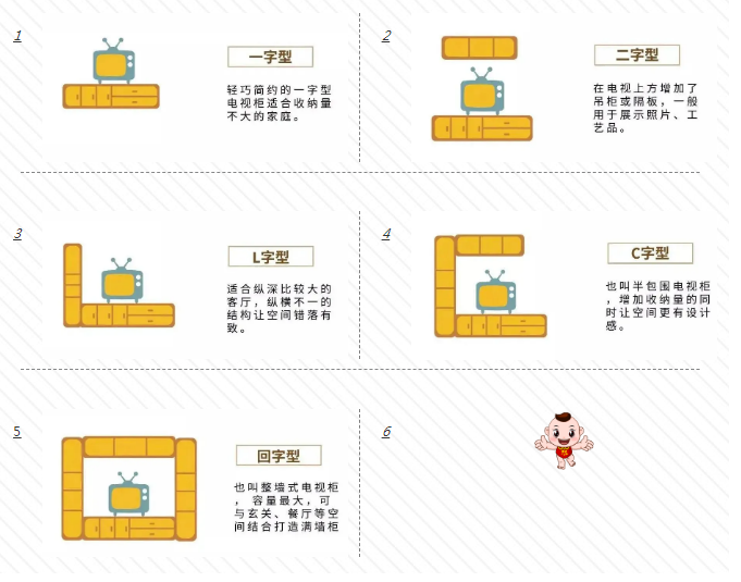 不同類型的電視柜有很多,其靈活的搭配能夠更加凸顯客廳的整體美觀。電視柜主要分為以下5種:一字型、二字型、L字型、C字型電視柜、回字型電視柜;