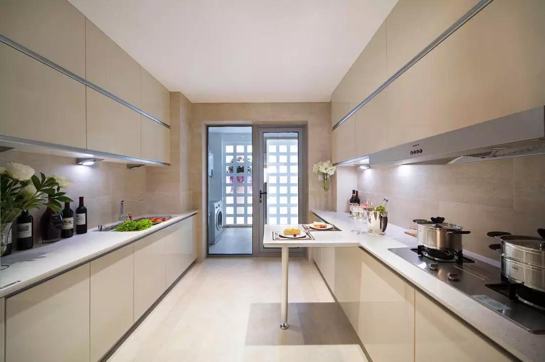 也叫雙一字型廚房,是最高效的廚房布局,最大化分配廚具和操作臺(tái)的空間,廚房長而窄,兩側(cè)都有空間,在走廊一側(cè)空間足夠的話,還可以設(shè)計(jì)一個(gè)溫馨小餐廳。