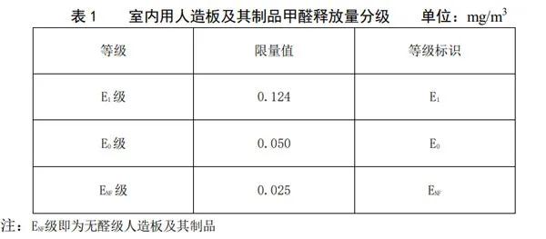 ★ 該標準將室內(nèi)用人造板及其制品的甲醛釋放量按照限量值分為3個等級,即E1級(≤0.124mg/m³)、E0級(≤0.050mg/m³)和ENF級(≤0.025mg/m³)。