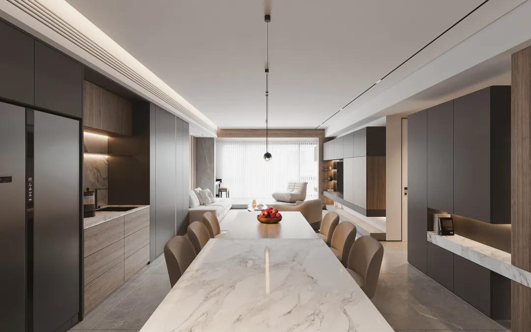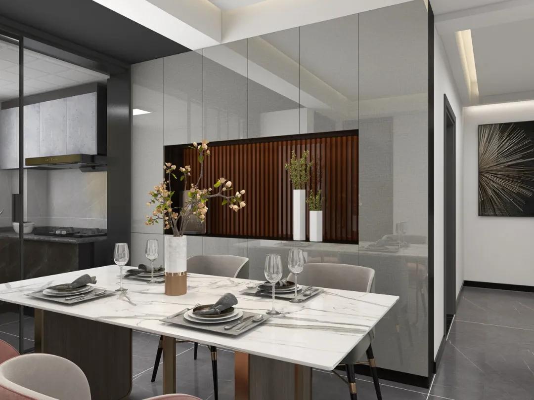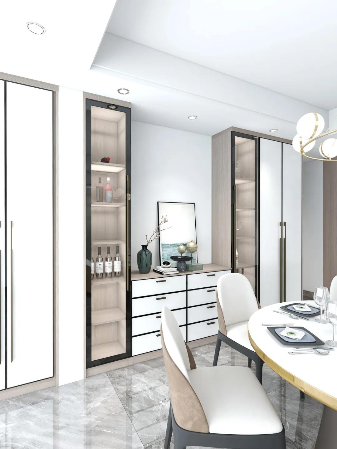搭配建議:超高門餐邊柜可搭配開放酒格或玻璃柜門,不僅拓寬收納思路,還能把適合擺放的物件拿出來,增加品味。
