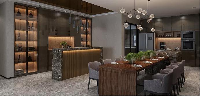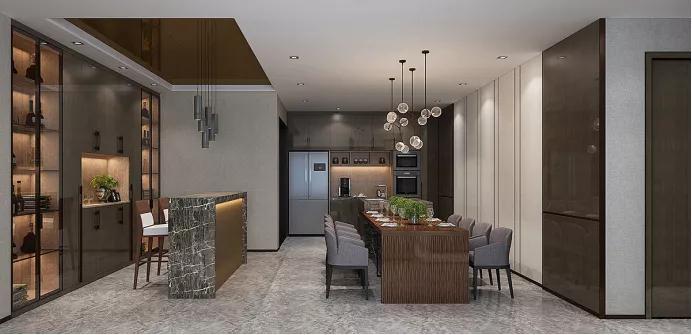 金屬酒柜充滿了輕奢氣韻,酒柜陳列錯落有致,精致在一瞬間充分體現(xiàn)。木材、金屬、玻璃的碰撞,別具一格!餐邊柜采用通透的黑色窄框玻璃門搭配,虛實結(jié)合,提升餐廳氣質(zhì)。