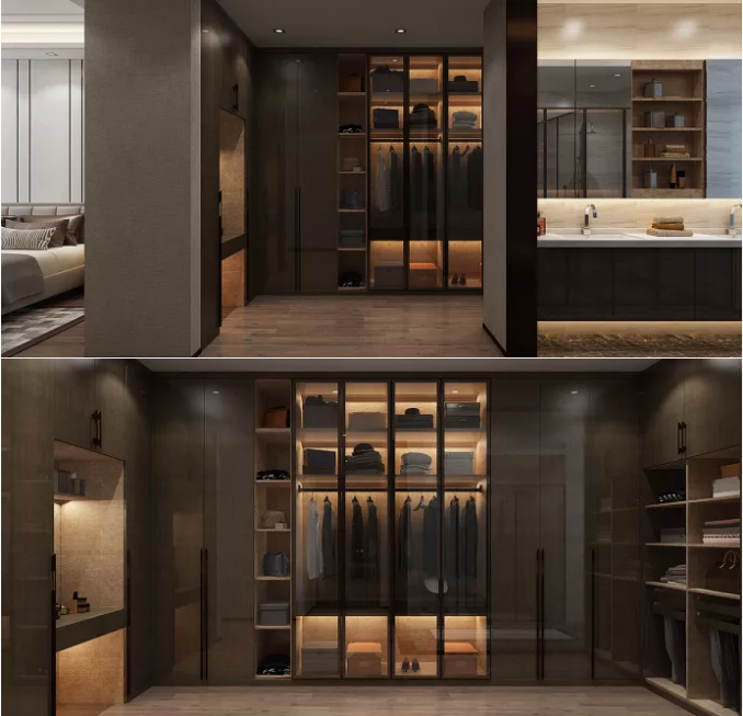生活不止于當(dāng)下,在節(jié)奏匆忙的生活里,“輕奢”屬于他們的生活態(tài)度。衣帽間在設(shè)計上跟全屋統(tǒng)一元素,衣柜中間設(shè)計梳妝區(qū)域,玻璃門里面柜子安裝了層板燈和開放格組合,讓整個空間更富有層次感。
