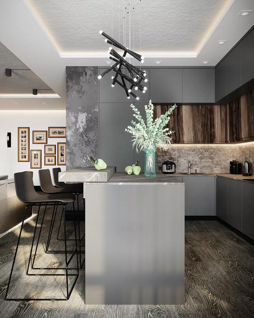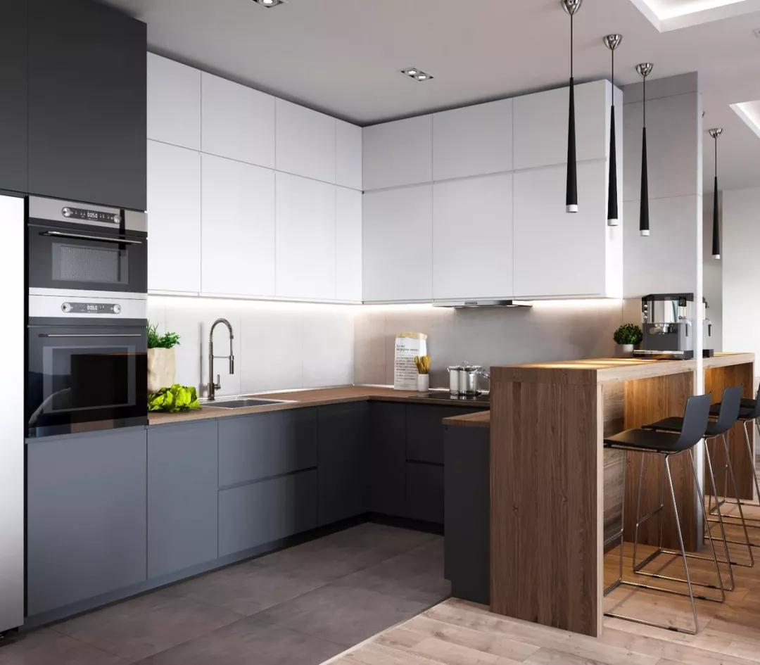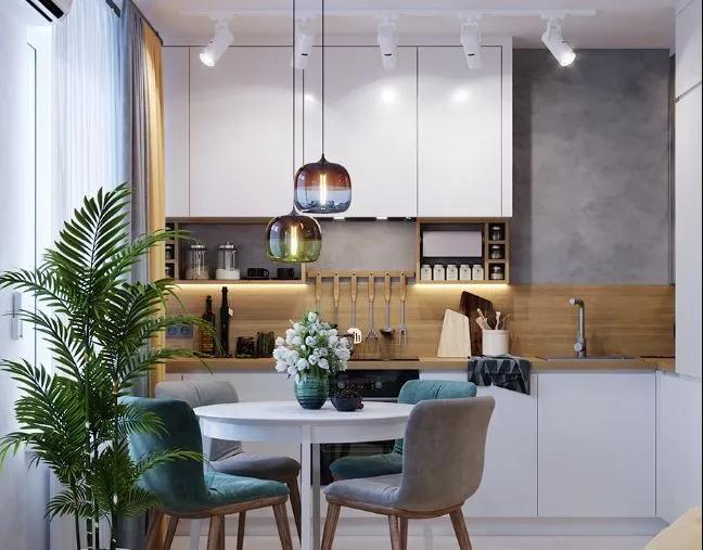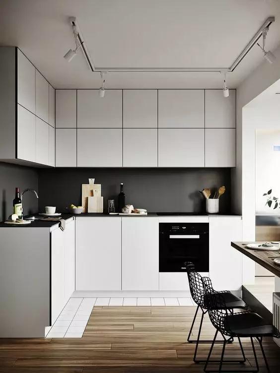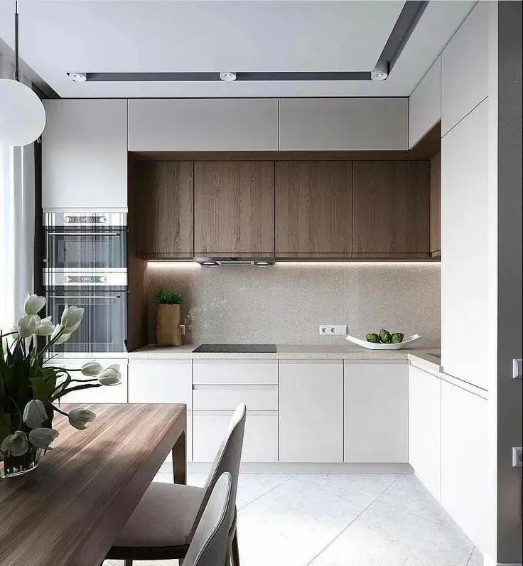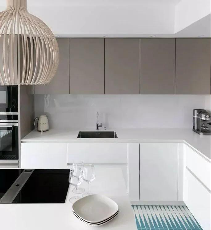如果你覺(jué)得純色太單調(diào),櫥柜可以用拼色,最常見(jiàn)的是吊柜和地柜用不同顏色,搭配簡(jiǎn)潔的無(wú)把手無(wú)造型的柜體設(shè)計(jì),非常有層次感。