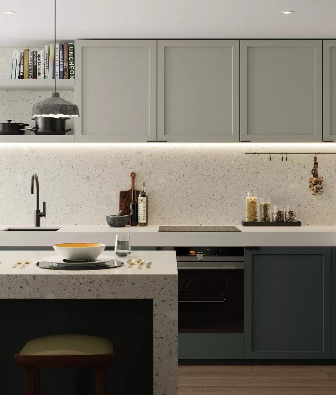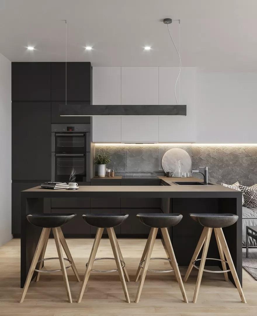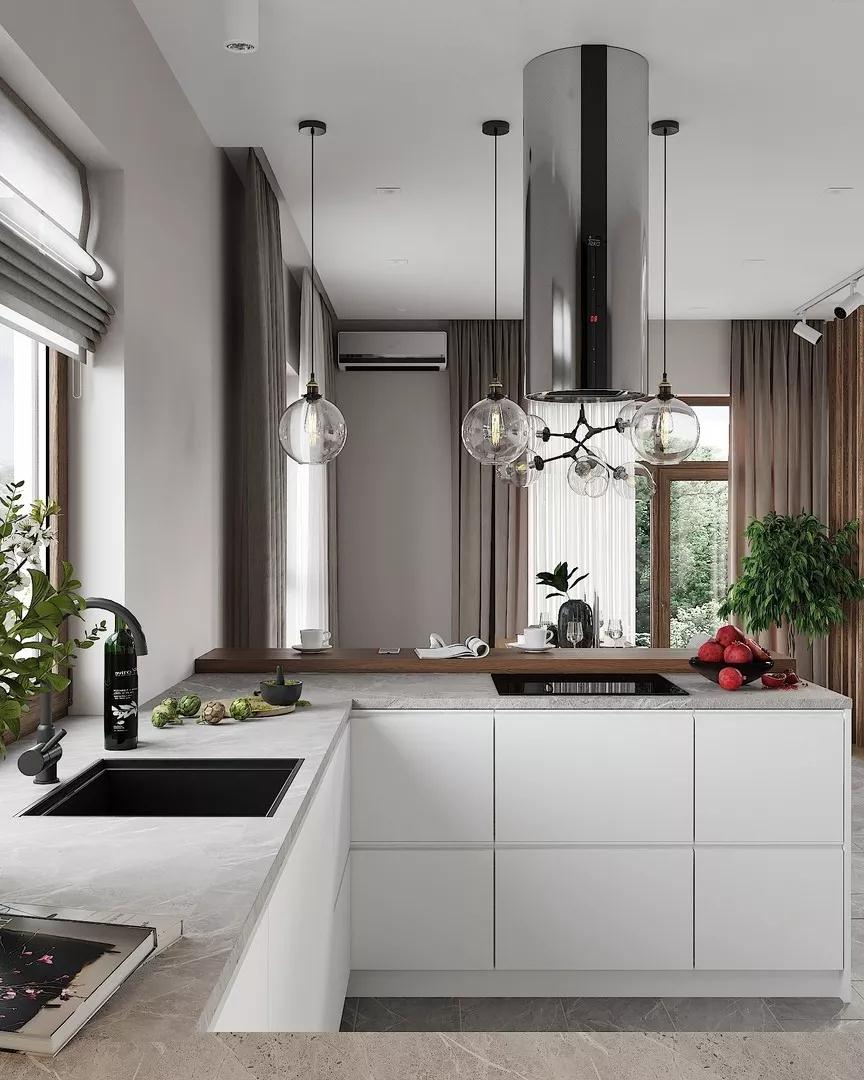 如果你覺(jué)得純色太單調(diào),櫥柜可以用拼色,最常見(jiàn)的是吊柜和地柜用不同顏色,搭配簡(jiǎn)潔的無(wú)把手無(wú)造型的柜體設(shè)計(jì),非常有層次感。