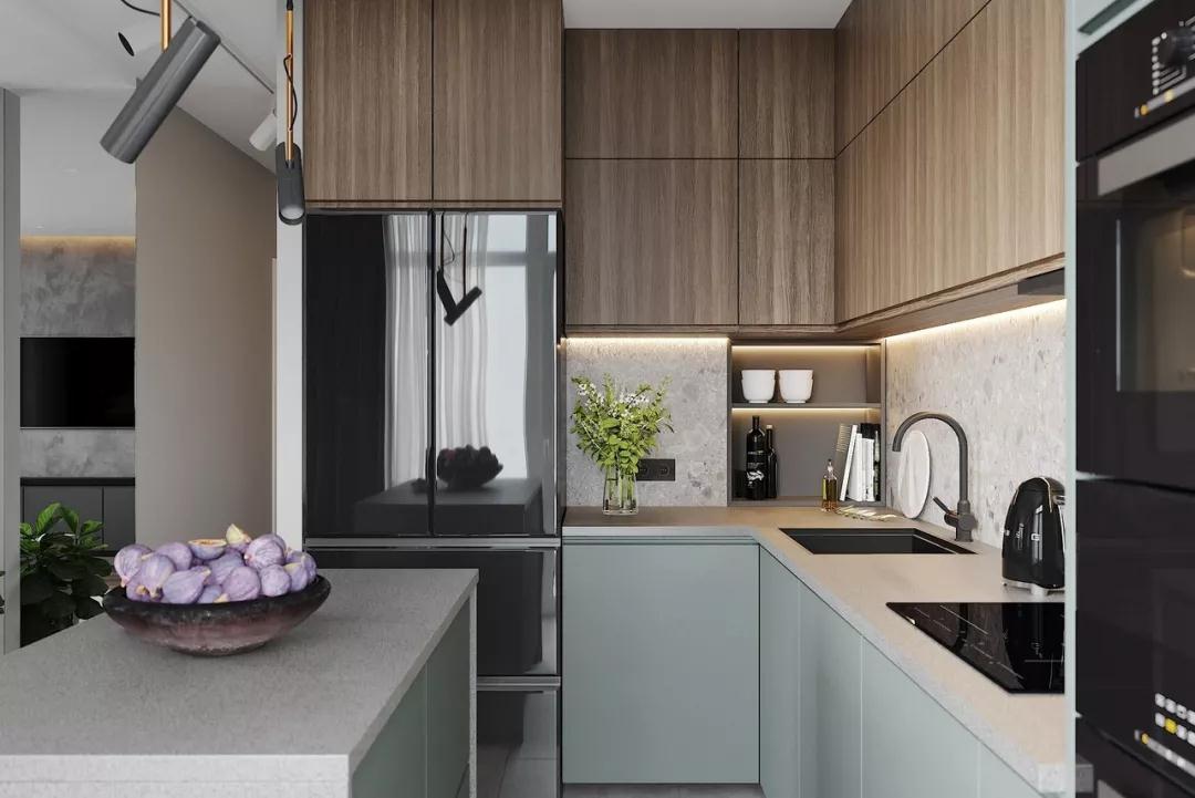 L型是當(dāng)下非常流行的一款廚房設(shè)計(jì),櫥柜及臺(tái)面將轉(zhuǎn)角的空間也利用了起來(lái),冰箱建議放在水槽旁,食材拿出來(lái)可以直接清洗,動(dòng)線更流暢。