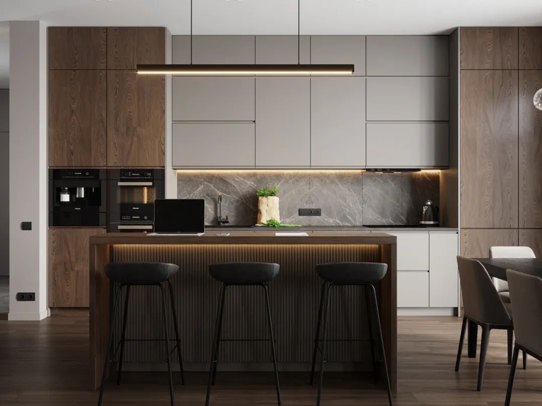 靠廚房設(shè)計(jì)為大理石或巖板,另外一邊設(shè)計(jì)為餐桌,這種設(shè)計(jì)動(dòng)線也十分流暢。大理石或巖板可以放洗好的菜和碗碟,另一邊可直接吃飯,這種空間少了隔墻隔斷,也會(huì)顯得更加開(kāi)闊明亮。
