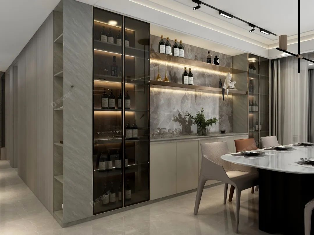餐邊柜內部空間采用不同的大小規(guī)格,錯落設計,使收納形式更加豐富。