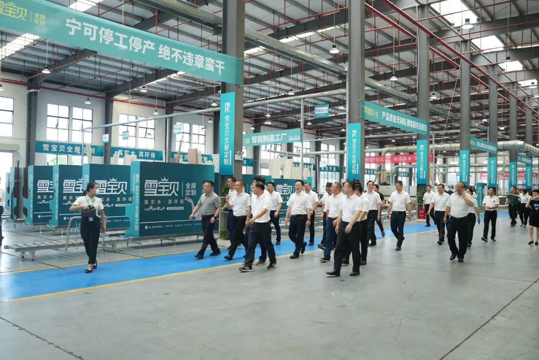 在雪寶現(xiàn)代化工廠(chǎng)觀摩中,市區(qū)領(lǐng)導(dǎo)一行通過(guò)儀器檢測(cè)體驗(yàn)了能釋放負(fù)離子的森林有氧板,了解了雪寶智能制造加工生產(chǎn)的標(biāo)準(zhǔn)作業(yè)工作流程,并且就如何把板材精準(zhǔn)無(wú)誤變成板件,最后成為家具柜的工藝全流程聽(tīng)取了匯報(bào)講解。