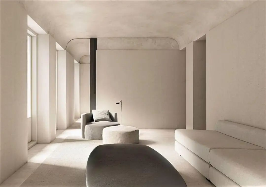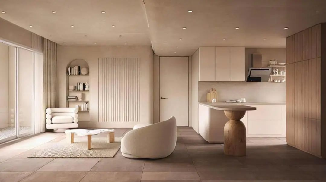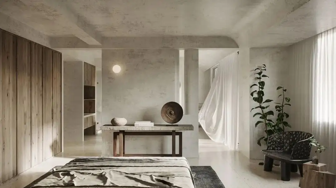 侘寂風(fēng)的設(shè)計(jì),沒(méi)有復(fù)雜的裝飾、圖案花紋,墻頂?shù)氐恼w造型盡量簡(jiǎn)潔大方。