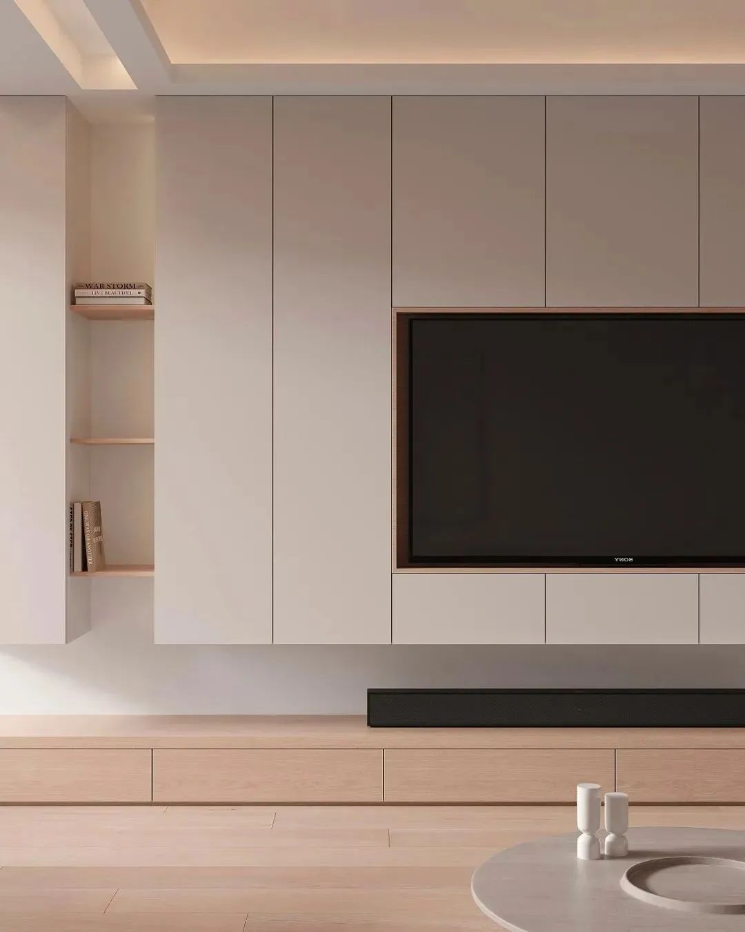 材質(zhì)方面為了符合奶油系風(fēng)格的調(diào)性,材質(zhì)上要選擇比較有肌理感的,像羔羊絨、棉麻、原木等材質(zhì)都很合適。