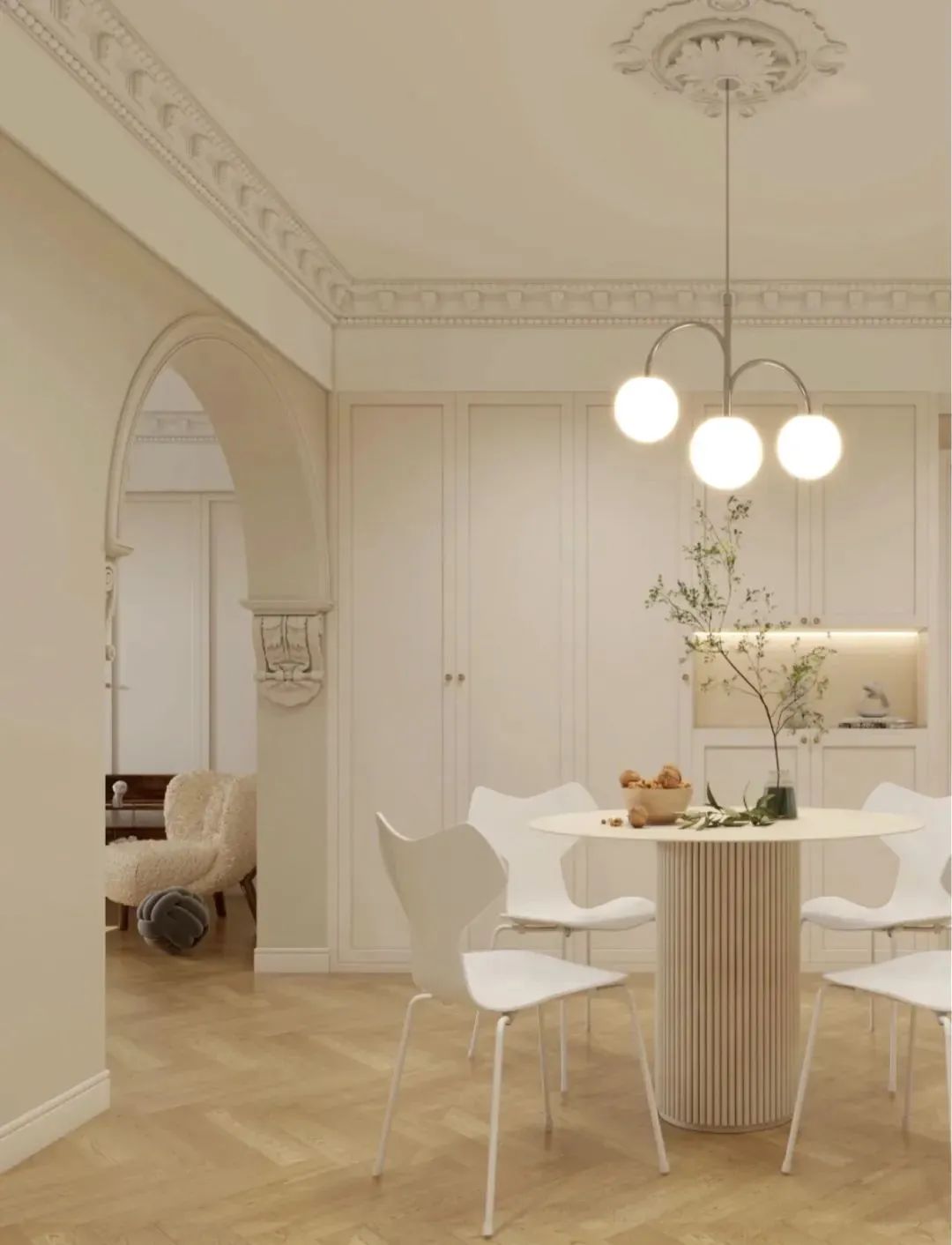 在奶油風(fēng)的設(shè)計(jì)中,對于造型的把握主要在家具造型的選擇,以及空間硬裝造型的設(shè)計(jì)上。