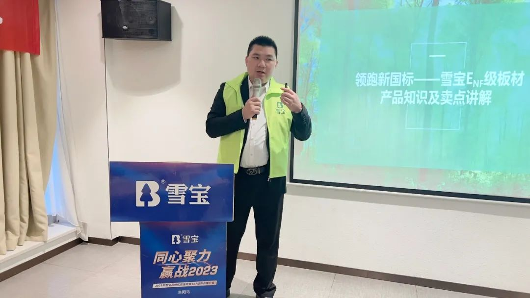 會上,雪寶華北生態(tài)板事業(yè)部區(qū)域負責人曹廣飛先生現(xiàn)場詳細解讀雪寶ENF級板材產品知識及核心賣點。