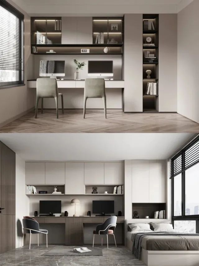 書柜與書桌的功能具有延續(xù)性,將兩者結(jié)合,設(shè)計成轉(zhuǎn)角式書桌柜,利用兩個墻面做一體化布局,空間利用更充分,十分適合小臥室。