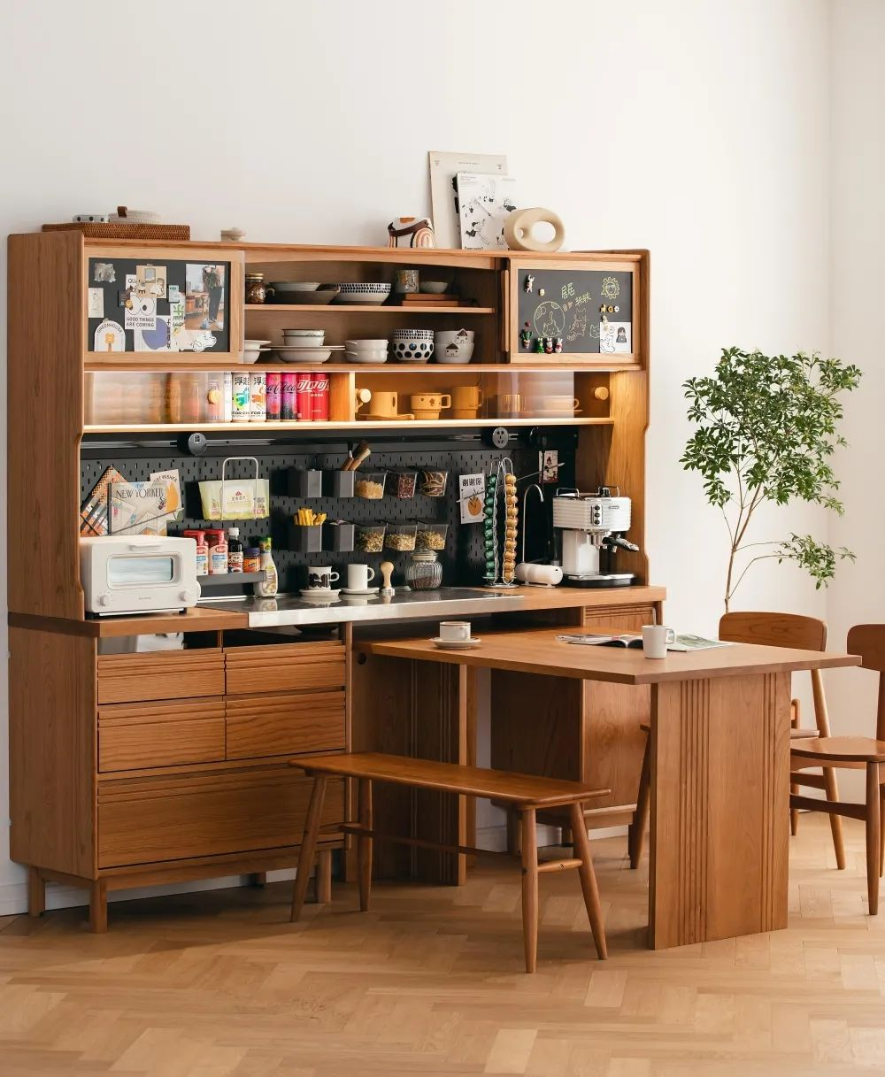 餐邊柜可以提供強(qiáng)大的收納功能,像廚具、餐具、一次性水杯、茶具、零食等等大小物品,都可以收納在餐邊柜里面,避免家里到處都是雜物亂擺的情況。