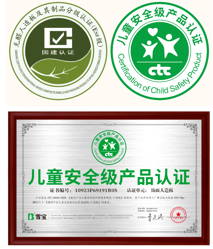 兒童安全級(jí)產(chǎn)品認(rèn)證,以更嚴(yán)苛的環(huán)保標(biāo)準(zhǔn)、更嚴(yán)謹(jǐn)?shù)恼J(rèn)證規(guī)則,旨為保障兒童活動(dòng)場(chǎng)所質(zhì)量及環(huán)境安全健康,也為踐行國(guó)家質(zhì)量強(qiáng)國(guó)戰(zhàn)略、保證兒童健康生活貢獻(xiàn)力量。本次獲得由中國(guó)國(guó)檢測(cè)試控股集團(tuán)股份有限公司(CTC)出具的兒童安全級(jí)產(chǎn)品認(rèn)證證書(shū)顯示:產(chǎn)品符合 CTS 05004-2020《建材產(chǎn)品兒童安全級(jí)評(píng)價(jià)技術(shù)規(guī)范人造板》的要求,進(jìn)一步有力證明了雪寶板材飾面人造板材系列產(chǎn)品的健康和環(huán)保性,同時(shí),雪寶板材產(chǎn)品環(huán)保性、安全性得到國(guó)家官方權(quán)威機(jī)構(gòu)的認(rèn)證,也是對(duì)我們致力拔高行業(yè)的產(chǎn)品環(huán)保水平新高度的認(rèn)可和肯定!