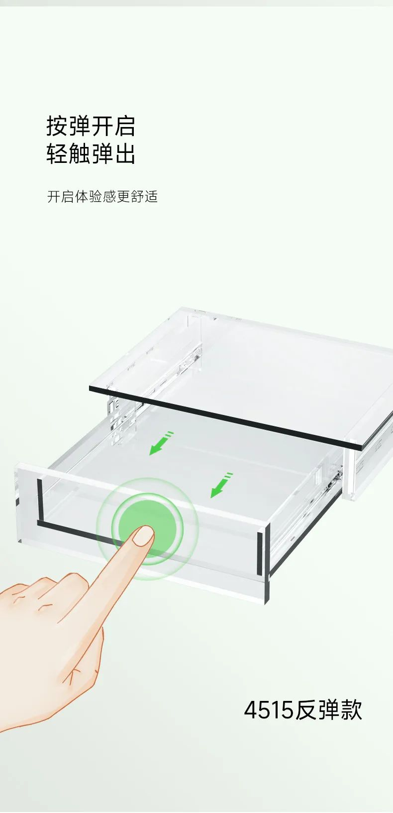 4515緩沖款:緩沖更平穩(wěn)4515反彈款:輕松按彈開(kāi)啟無(wú)論是緩沖款還是反彈款,都具備下述優(yōu)勢(shì):1、上海寶鋼原材料,高光封閉電鍍,抗銹能力極強(qiáng);2、加厚三節(jié)鋼珠抽屜滑軌,標(biāo)準(zhǔn)厚度,經(jīng)久耐用;3、進(jìn)口高精圓鋼珠,平穩(wěn)、順暢,開(kāi)合更靜音;4、三節(jié)軌全拉出,抽屜一覽無(wú)余,空間最大化;5、承重30kg,平穩(wěn)堅(jiān)固;6、防撞膠墊,降噪消音;
