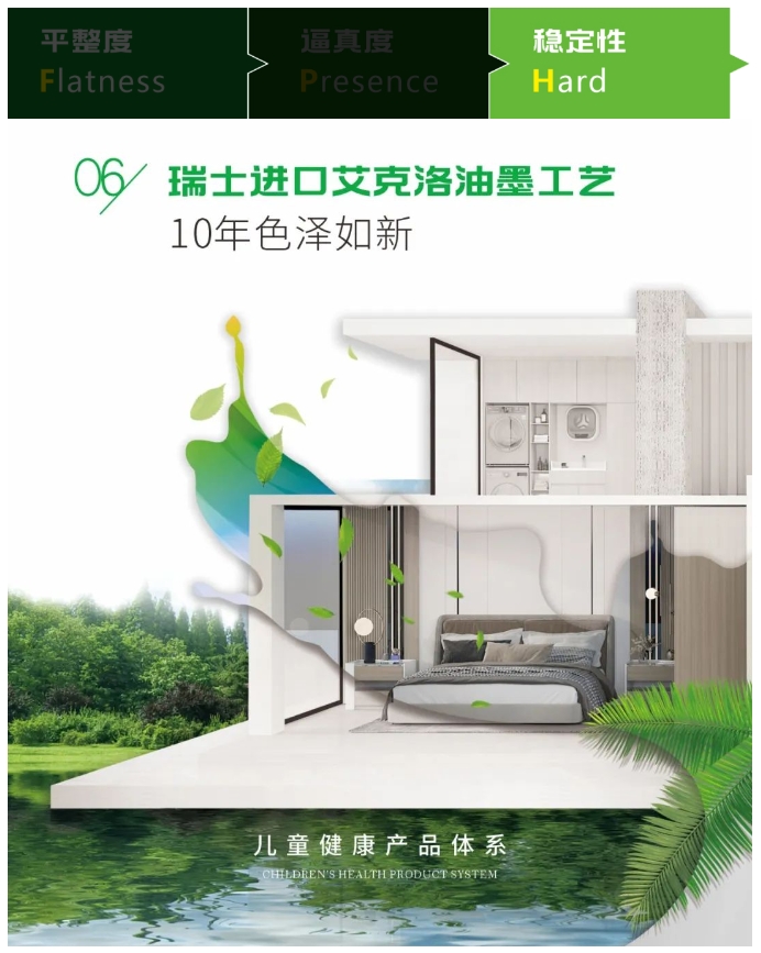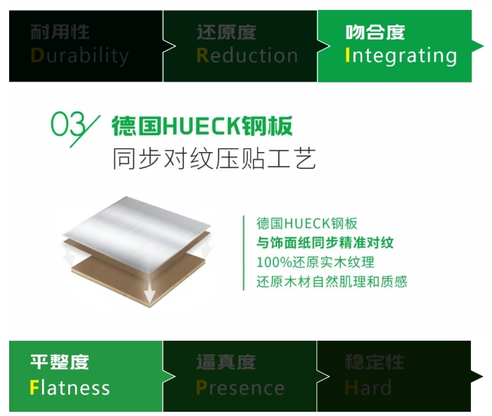 從飾面紙張的耐用性(Durabilityt)、3D印刷技術(shù)實木紋理的還原度(Reduction)、鋼板與飾面紙同步精準對紋壓貼的吻合度(Integrating)、2次雙面定厚砂光板面的平整度(Flatness)、4+1色印刷技術(shù)的飾面效果逼真度(Presence)、進口艾克洛油墨工藝締造10年色澤如新的穩(wěn)定性(Hard)6個維度創(chuàng)造,100%還原實木紋理。