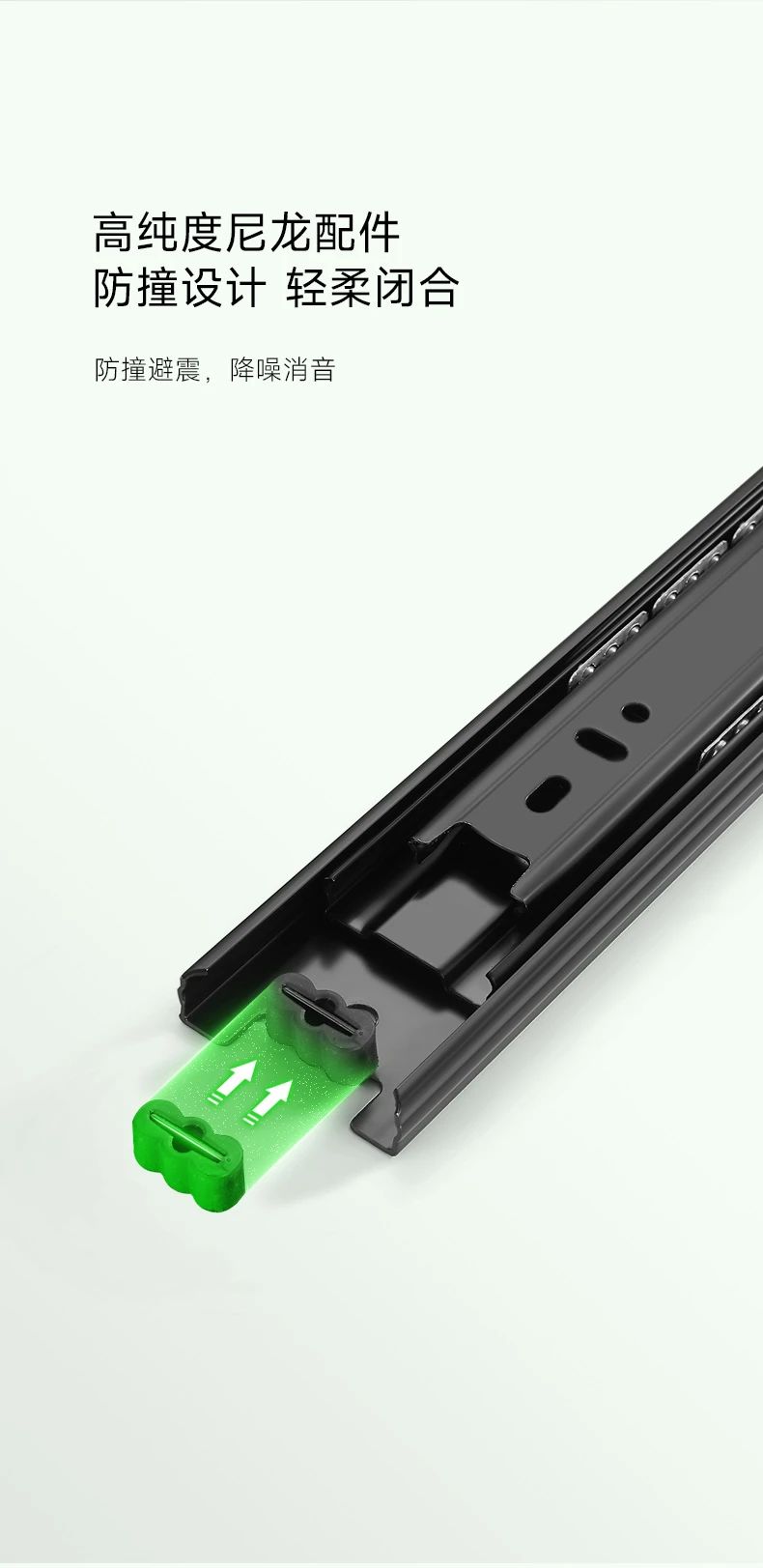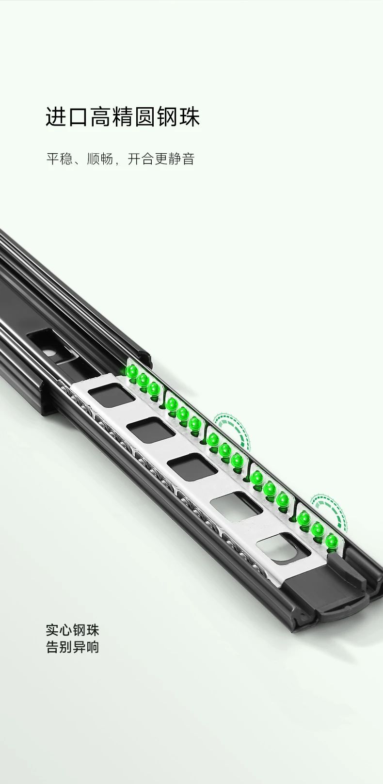 抽屜在家具中的使用很關(guān)鍵,對(duì)于抽屜而言,滑軌就是抽屜的“心臟”。于家居收納中有著無與倫比的作用,讓空間在無序中建立有序。而抽屜的使用體驗(yàn),絕大程度上取決于滑軌。開合是否能順滑、能抽拉到什么程度、承重如何、會(huì)不會(huì)翻傾等問題,都跟滑軌有關(guān)系,因此選擇一個(gè)品質(zhì)好的滑軌很重要。雪寶4512黑色鋼珠三節(jié)滑軌,精工設(shè)計(jì),內(nèi)置鋼珠,穩(wěn)定性強(qiáng),全程順滑到底。三節(jié)全拉出設(shè)計(jì),抽屜空間一覽無余,物品收納整齊有序,取物更輕松。表面電鍍工藝,抗腐蝕,耐磨損,久用如新,無需頻繁更換。苛求品質(zhì)細(xì)節(jié),讓每一次推拉都是一種享受!