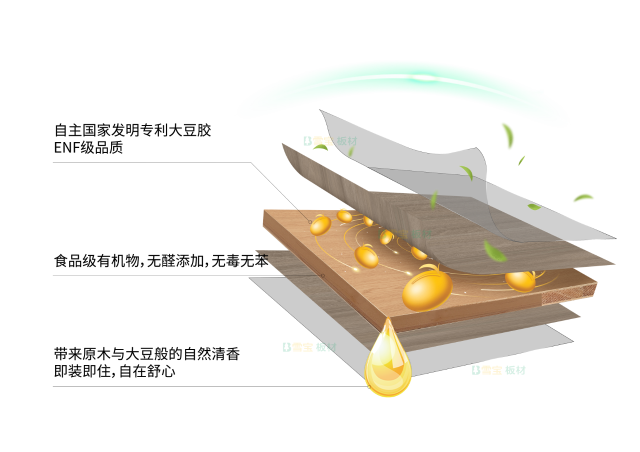 使用自主擁有的國家發(fā)明專利大豆膠(利用純天然、可再生的豆粕為原料,精萃大豆活性蛋白,濃縮為性能優(yōu)異的生物質(zhì)大豆膠)進(jìn)行黏合,0醛添加,環(huán)保等級達(dá)到新國標(biāo)ENF級,無需擔(dān)心甲醛釋放問題,且具有卓越的耐水性、粘結(jié)性,品質(zhì)穩(wěn)定,是您打造家居空間的放心之選。