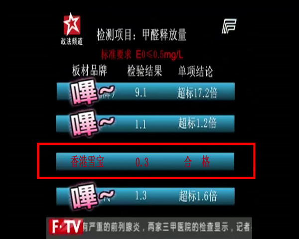 政法頻道3.15期間特別節(jié)目《陽光下的315》中,記者暗訪了某大型建材市場中的各板材專賣店,也抽取了其中某些品牌產(chǎn)品進(jìn)行甲醛釋放量檢測,其中雪寶E0級別的板材也被隨機(jī)抽查,與其它品牌板材一起接受了檢驗。