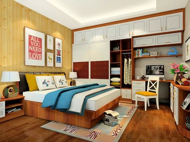 ①可以將衣柜與書柜一體化設(shè)計(jì),書桌空間往上延伸可利用隔板解決零碎物品的收納和陳列問題。
