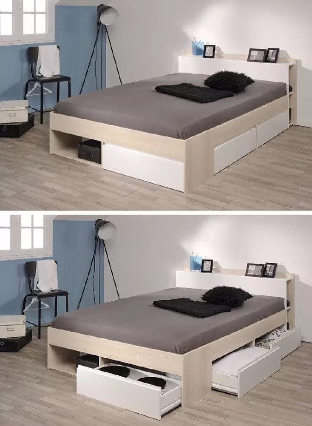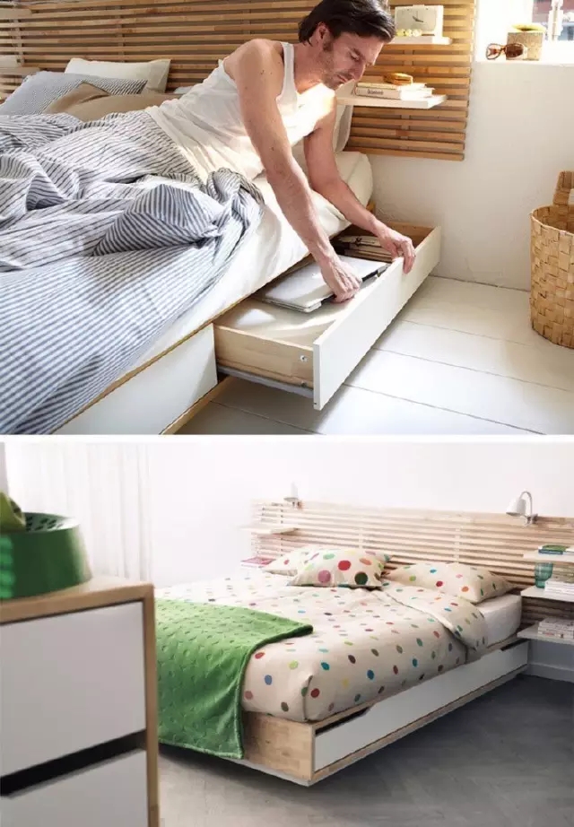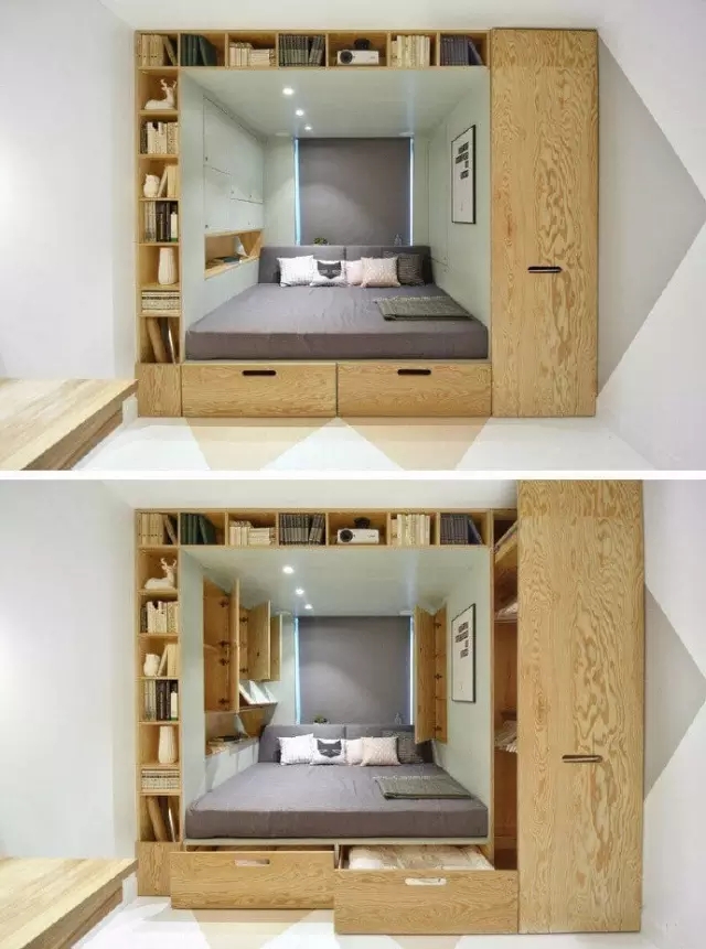 將抽屜和床架融為一體,醒來(lái)就能拿到更換的衣服或者也可以放上電腦手機(jī),立馬工作,平時(shí)看上去就是個(gè)普普通通的床,將一切雜亂隱于無(wú)形,是不是很理想?