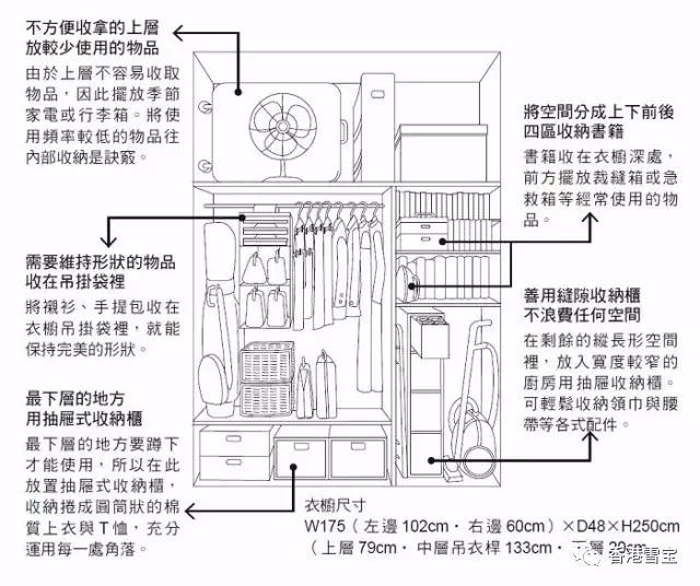 隔間較多的空間,要先決定物品的收納位置。上層放不常用的物品,下層右邊放生活用品,左邊放衣物。像這樣做好大致分類,再依照空間大小進(jìn)行收納。